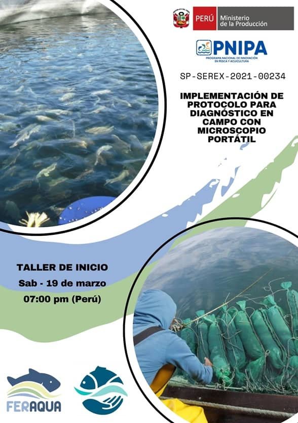 Es así como las empresas FERAQUA y AcuiVetLife formaron una alianza y presentaron una propuesta al Programa Nacional de Innovación en Pesca y Acuicultura – PNIPA para elaborar Protocolo de Diagnóstico en Campo con Microscopio Portátil, en esta primera etapa para dos especies de interés acuícola como la trucha arcoíris y la concha de abanico. Por tal motivo los queremos invitar a participar en el taller de inicio el sábado 19 de marzo a las 07:00 de la noche, para inscribirse llene el siguiente formulario https://forms.gle/2yb6mJvPjN7La6Ct6, dentro de las actividades de ejecución tendremos una capacitación en diagnóstico para los interesados.