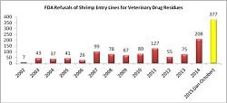 Acumulativamente, las líneas de entrada de camarón rechazadas por la FDA por razones relaciones a los antibióticos prohibidos durante el 2015, exceden sustancialmente las acciones de la agencias durante los últimos trece años.