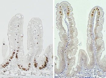 La respuesta que es la maduración de las células intestinales, que ocurre mientras que ellas se desvían de su “lugar de origen”en los pliegues de los intestinos y hasta la parte superior, es mucho más lento en el salmón (de sangre fría) que en los animales de sangre caliente. La renovación de las células intestinales sólo requiere de pocos días en los mamíferos, pero toma varias semanas en el salmón. Además, el proceso fue más lento cuando el agua alrededor del salmón fue de 8 oC, en vez de 12 oC.
