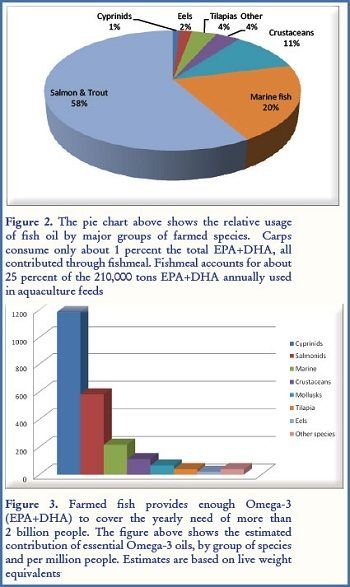 Basados en los supuestos mencionados, el sector de la acuicultura provee 206 000 t de EPA+DHA, pero al mismo tiempo consume un total de 210 000 t; en la practica provee la misma cantidad que consume. La figura 3 muestra las principales especies de cultivo que proveen los omega-3 de cadena larga a nuestras dietas. En la actualidad, el sector de la acuicultura provee el suficiente EPA+DHA para cubrir las necesidades de más de 2.0 billones de personas. Todas las carpas combinadas consumen menos del 1.0% de todo el EPA+DHA proveído por el aceite y harina de pescado, pero contribuye con más de 50% de todo el EPA y DHA que proviene de los productos acuícolas.