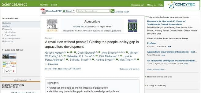 A continuación presentamos un pequeño tutorial de búsqueda de información en acuicultura. Este ejemplo, se basó en la web de la Universidad Nacional del Santa (UNS) www.uns.edu.pe y la base de datos Science Direct, pero es similar para Scopus: